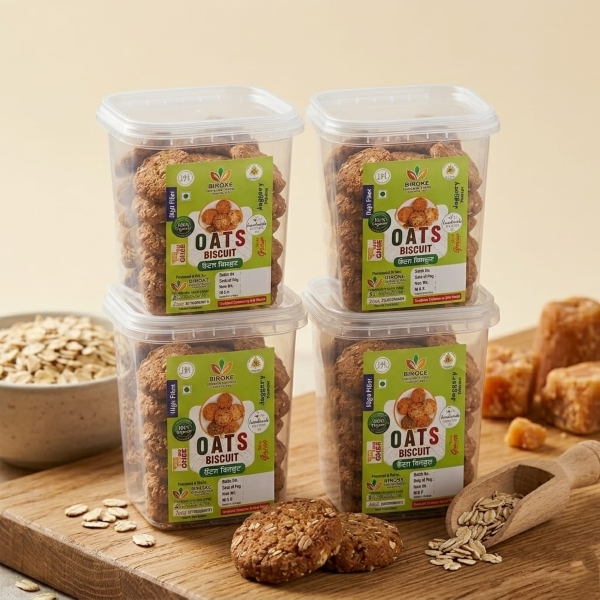 Oats biscuits are a type of biscuit made with rolled oats as the primary ingredient, blended with flour and other ingredients like sugar, butter, and flavorings such as cinnamon or nuts. They are known for their nutritious qualities, including high fiber content, and a characteristic nutty and crunchy texture. Popular as a healthy snack, oats biscuits can be enjoyed with tea or coffee and are a popular alternative to traditional cookies or cereal, especially for health-conscious individuals. Location : Punjab, India