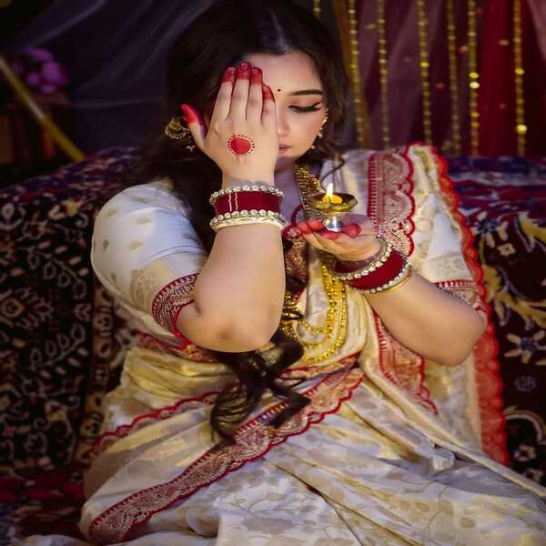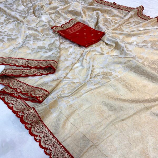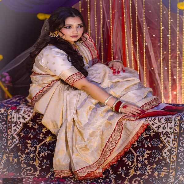 A khaddi georgette designer saree is a handwoven silk saree, primarily from Banaras, featuring the lightweight, flowing drape of georgette with intricate, opulent gold and silver zari (metallic thread) motifs like florals, paisleys, and geometric patterns, created by a special twisted-yarn weave that gives the fabric a rich texture and airy lightness perfect for special occasions. Location : West Bengal, India