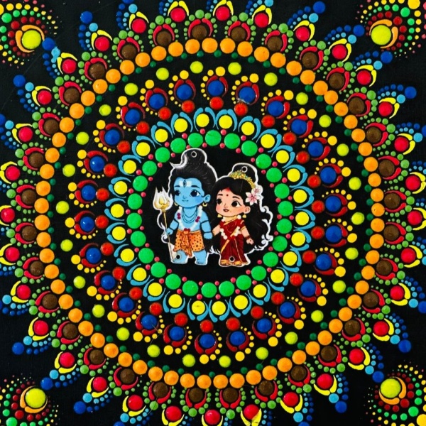 1040 Piece Description : A Gauri Shankar Dot Mandala Wall Painting Is A Vibrant And Meditative Artwork Depicting The Divine Union Of Lord Shiva (shankar) And Goddess Parvati (gauri) Using The Intricate And Spiritual Technique Of Dot Mandala. It Combines The Sacred Symbolism Of The Cosmic Couple With The Calming, Therapeutic Process Of Dot Art, Resulting In A Piece That Is Both Aesthetically Beautiful And Spiritually Meaningful. Location : New Delhi, India