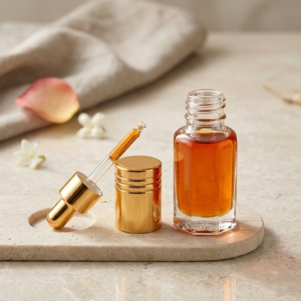 Saffron shamama is a traditional, alcohol-free attar (perfume oil) from India, known for its warm, spicy, and earthy aroma. This complex scent is created through a secret, centuries-old hydrodistillation process using a blend of many natural ingredients, with saffron being a prominent note alongside others like sandalwood, musk, henna, and various spices. The resulting oil offers a rich, layered fragrance that evolves on the skin and is prized for its exceptional longevity. Primarily used as a winter perfume and for special occasions, saffron shamama provides a comforting, unique, and long-lasting oriental fragrance experience. Location : Uttar Pradesh, India