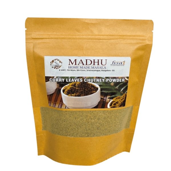 185 Packet Net Weight : 250 Gram Description : Curry Leaves Chutney Powder (karibevu Chutney Pudi) Enjoy The Natural Goodness Of Curry Leaves With Our Curry Leaves Chutney Powder, A Healthy South Indian Condiment Packed With Flavor And Nutrition. Roasted Curry Leaves Are Blended With Lentils, Chilies, Garlic, And Spices To Create A Rich, Aromatic Chutney Powder That Pairs Well With Any Meal. 1. Authentic South Indian Recipe 2. Rich In Iron & Antioxidants From Fresh Curry Leaves 3. Nutritious & Flavorful Side Dish 4. 100% Natural – No Preservatives 5. Versatile Use With Rice, Idli, Dosa, Or Chapati 6. Mix 1–2 Tsp With Ghee/oil Or Curd. Enjoy With Hot Rice Or As A Side Dish For South Indian Breakfasts. Location : Karnataka, India