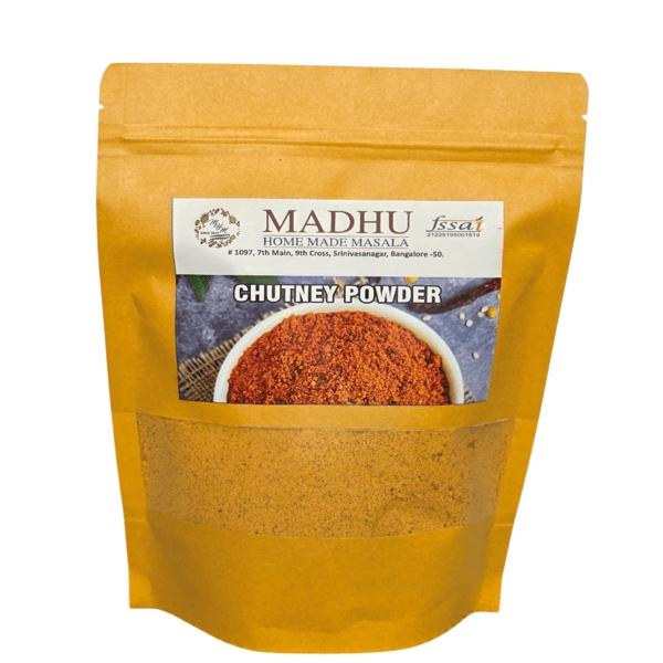 185 Packet Net Weight : 250 Gram Description : Chutney Powder – Traditional South Indian Chutney Pudi Bring Home The Taste Of Tradition With Our Chutney Powder, A Flavorful Blend Of Roasted Lentils, Red Chilies, Curry Leaves, Garlic, And Spices. All 100% Natural With Home Made Taste. This Multipurpose Condiment Adds A Spicy, Tangy Kick To Your Meals. 1. Traditional South Indian Recipe 2. Aromatic, Spicy & Tangy Flavor 3. 100% Natural & Preservative-free 4. Versatile Side Dish For Any Meal 5. Great With Rice, Dosa, Idli & Chapati 6. Mix With Ghee, Oil, Or Curd. Serve As A Dip, Spread, Or Rice Mix. Location : Karnataka, India