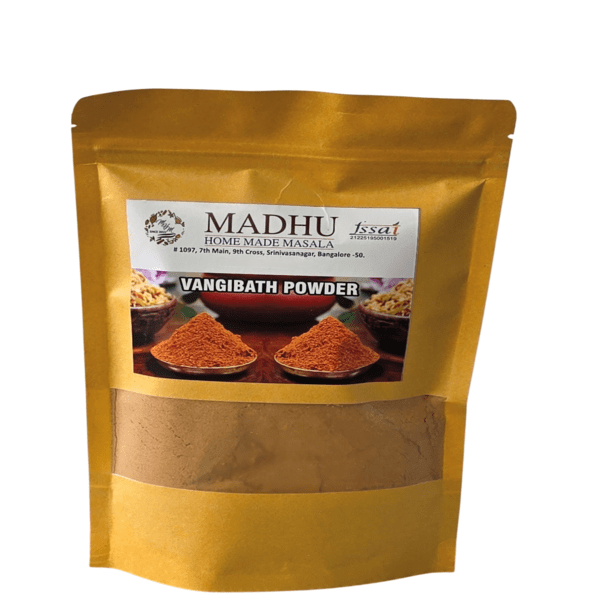 173 Packet Net Weight : 250 Gram Description : Vangibath Powder – Spiced Brinjal Rice Mix Make The Classic South Indian Brinjal Rice Effortlessly With Our Vangibath Powder. A Robust Blend Of Roasted Spices And Lentils, This Powder Delivers The Authentic Taste Of Karnatakas Famous Vangibath Dish. 1. Traditional Vangibath Spice Mix 2. Made With Roasted Coriander, Chilies & Curry Leaves 3. No Preservatives Or Artificial Colors 4. Quick & Easy Preparation 5. Works With Brinjal, Capsicum, Or Mixed Vegetables 6. Fry Vegetables, Add Cooked Rice, And Mix With 2–3 Tsp Of Vangibath Powder For Authentic Flavor. Location : Karnataka, India