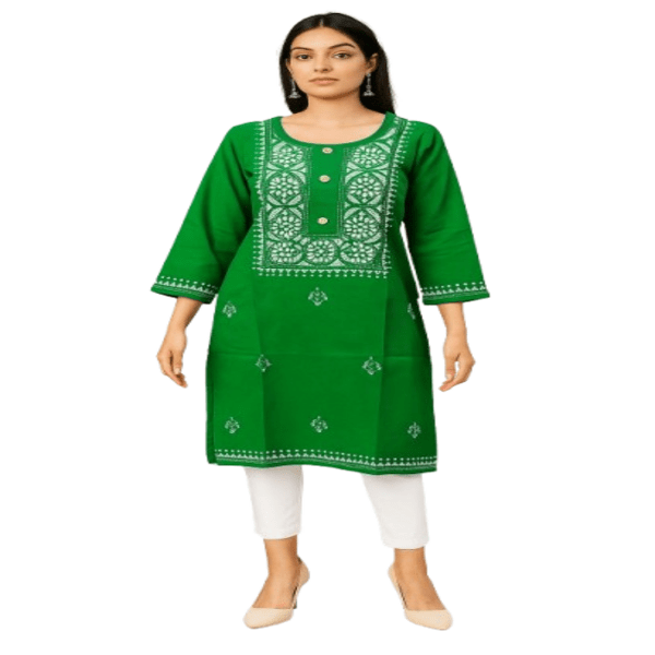 4950 Piece Description : A Cotton Long Kurti Is A Comfortable, Lightweight, And Breathable Tunic Made From Soft Cotton Fabric, Extending To Or Beyond The Knee. It Is A Versatile Garment, Ideal For Daily Wear, Casual Outings, Or Semi-formal Occasions, Offering A Relaxed Fit That Allows For Unrestricted Movement. Long Kurtis Are Available In Various Styles, Colors, And Prints And Can Be Paired With Leggings, Pants, Or Jeans For Different Looks. Location : West Bengal, India