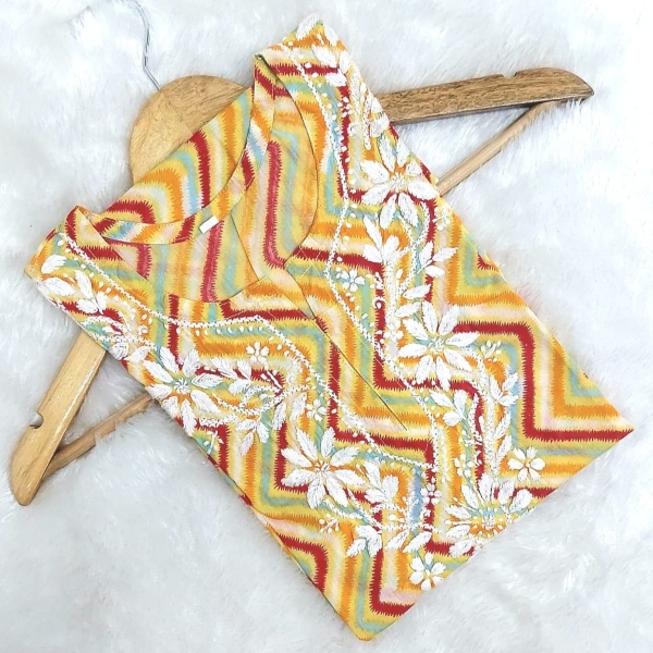 779 Piece Description : A Leheriya Print Embroidered Chikankari Short Top Is A Short-length Top That Combines A Vibrant, Wavy Leheriya Print With Intricate, Hand-embroidered Chikankari Work, Creating A Unique And Stylish Fusion Of Traditional Indian Crafts. The Leheriya Pattern Is A Colorful, Tie-dye Technique From Rajasthan, While The Chikankari Is A Delicate Hand-embroidery Style From Lucknow, Often Featuring Floral Or Paisley Motifs. These Elements Are Combined To Create A Top That Is Both Lively And Elegant, Perfect For Casual Or Festive Wear. Location : Uttar Pradesh, India