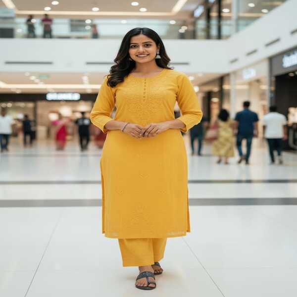 1885 Set Description : A Rayon Cotton Chikankari Kurti With Palazzo Set Is A Two-piece Outfit Featuring A Long Kurti (tunic) And A Matching Palazzo (wide-leg Pants), Both Made From Lightweight Rayon Cotton. The Kurti Is Adorned With Delicate, Hand-embroidered Chikankari Work, A Traditional Craft From Lucknow, Which Gives The Set A Blend Of Traditional And Modern Appeal. The Breathable Rayon Fabric Ensures Comfort For All-day Wear, Making It Suitable For Both Casual And Festive Occasions. Location : Uttar Pradesh, India
