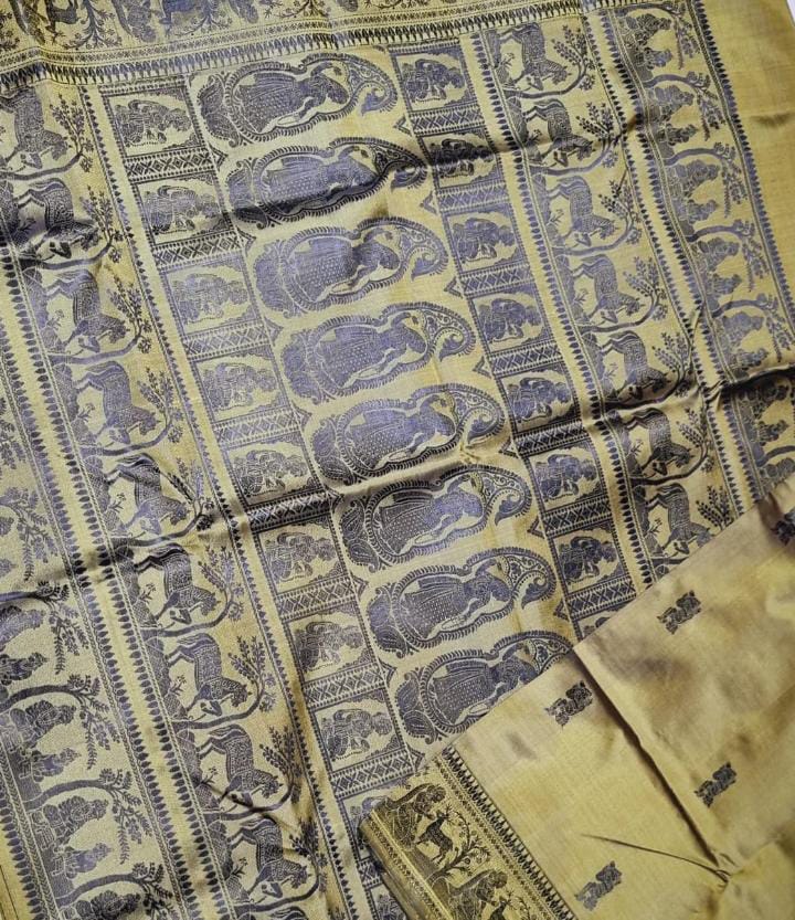 9100 Piece Description : Baluchari Saris Illustrate Hindu Mythological Scenes, Nature, Folklore, Legends, Historical Events, And Abstract Designs. They Showcase Gods, Heroes, Nature Elements, Love Stories, Battles, And Contemporary Patterns. Location : West Bengal, India