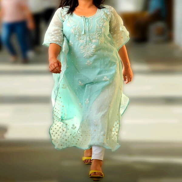 6370 Piece Description : A Chikankari Kaftan Is A Loose, Flowing Garment Featuring Delicate, Hand-stitched Embroidery Known As Chikankari, Which Originated In Lucknow, India. These Kaftans Are Made From Fabrics Like Cotton, Silk, Or Georgette, And Are Designed For Comfort And Style, Often Worn For Casual Or Festive Occasions. The Embroidery Typically Uses White Thread On Light-colored Or Pastel Fabrics, Creating An Elegant, Artisanal Look. Location : Uttar Pradesh, India