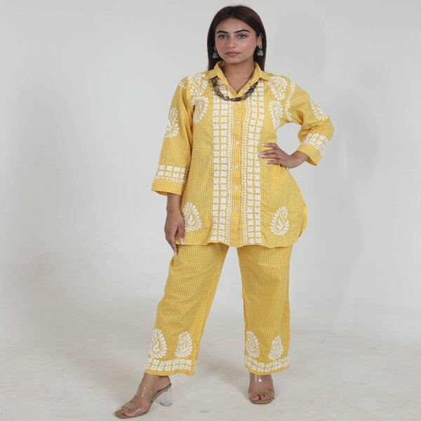 4550 Set Description : A Chikankari Co-ord Set Is A Matching Ensemble, Typically Consisting Of A Top And Bottom, That Features The Traditional, Delicate Hand-embroidery Known As Chikankari. Originating In Lucknow, India, This Ancient Art Form Is Famous For Its Intricate, Ornate Floral Motifs And Fine Needlework. The Resulting Co-ord Sets Blend Traditional Craftsmanship With Modern Silhouettes, Making Them Both Elegant And Versatile. Location : Uttar Pradesh, India