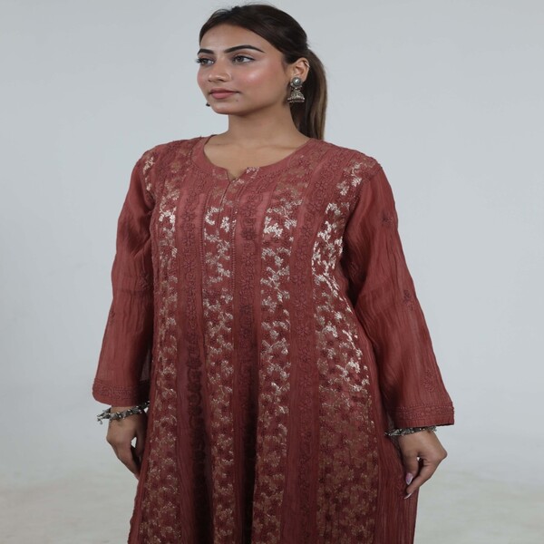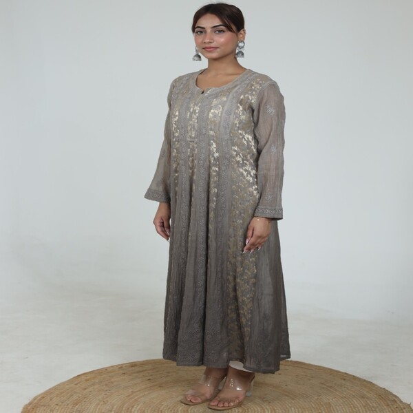 5850 Piece Description : A Chikankari Anarkali Is A Traditional Indian Outfit Featuring The Elegant Anarkali Silhouette Enhanced By Chikankari, A Delicate Hand Embroidery Technique From Lucknow. This Style Combines The Graceful, Floor-length Flow Of The Anarkali With The Intricate, Often White-on-pastel, Hand-stitched Patterns Of Chikankari, Creating A Dress That Is Both Classic And Sophisticated. Location : Uttar Pradesh, India