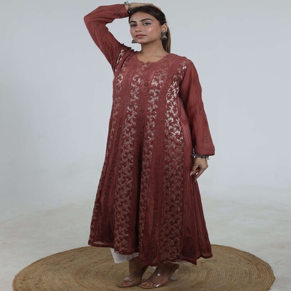 5850 Piece Description : A Chikankari Anarkali Is A Traditional Indian Outfit Featuring The Elegant Anarkali Silhouette Enhanced By Chikankari, A Delicate Hand Embroidery Technique From Lucknow. This Style Combines The Graceful, Floor-length Flow Of The Anarkali With The Intricate, Often White-on-pastel, Hand-stitched Patterns Of Chikankari, Creating A Dress That Is Both Classic And Sophisticated. Location : Uttar Pradesh, India