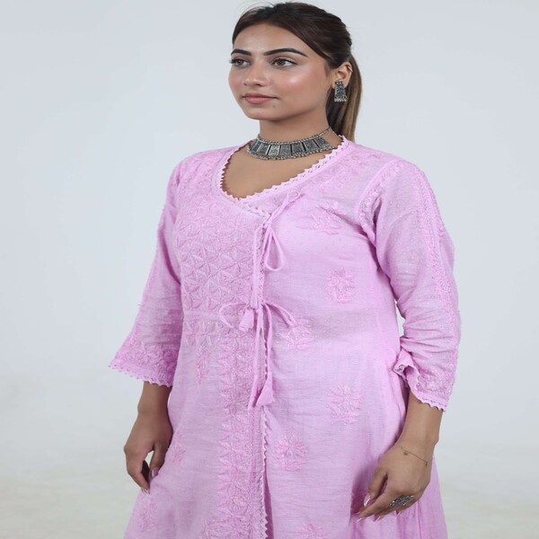 3899 Piece Description : A Chikankari Tie-up Angarkha Is A Traditional Indian Tunic That Elegantly Merges The Classic Wrap-around Angarkha Silhouette With The Intricate Hand-embroidery Of Chikankari From Lucknow. This Garment Features An Overlapping Front Panel Secured With A Side Tie, Often Adorned With Tassels, Creating A Flattering, Adjustable Fit. The Surface Is Richly Embellished With Delicate, Hand-stitched Patterns—such As Floral Motifs Created Using Traditional Stitches Like Bakhiya (shadow Work) And Phanda (knot Stitches). The Result Is A Sophisticated And Timeless Piece That Celebrates Artisanal Craftsmanship, Suitable For A Range Of Occasions From Casual Daytime Wear To Festive Evening Events. Location : Uttar Pradesh, India