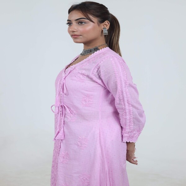 3899 Piece Description : A Chikankari Tie-up Angarkha Is A Traditional Indian Tunic That Elegantly Merges The Classic Wrap-around Angarkha Silhouette With The Intricate Hand-embroidery Of Chikankari From Lucknow. This Garment Features An Overlapping Front Panel Secured With A Side Tie, Often Adorned With Tassels, Creating A Flattering, Adjustable Fit. The Surface Is Richly Embellished With Delicate, Hand-stitched Patterns—such As Floral Motifs Created Using Traditional Stitches Like Bakhiya (shadow Work) And Phanda (knot Stitches). The Result Is A Sophisticated And Timeless Piece That Celebrates Artisanal Craftsmanship, Suitable For A Range Of Occasions From Casual Daytime Wear To Festive Evening Events. Location : Uttar Pradesh, India