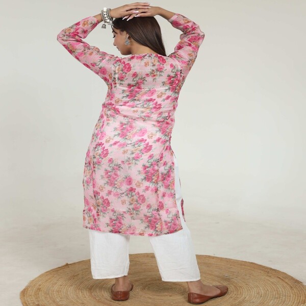 A chikankari floral kota kurta is a lightweight, cotton-based, straight-cut top featuring delicate hand-embroidered floral patterns. The kurta is made of a traditional, fine, woven Kota fabric, with the embroidery, usually in white cotton thread, applied over a pre-printed floral design. Key features include a straight silhouette, round or U-neckline, and typically three-quarter or long sleeves. Location : Uttar Pradesh, India
