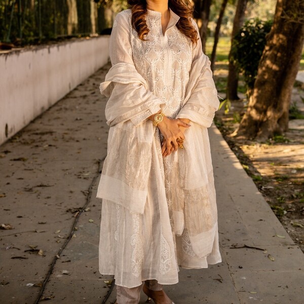 A chikankari silver tissue anarkali is a formal, floor-length anarkali suit made from shimmering silver tissue fabric, featuring traditional hand-embroidered chikankari work, often enhanced with embellishments like sequins or cutdana. It has a flowing, flared silhouette that creates a regal and elegant look, suitable for festive occasions and weddings. Location : Uttar Pradesh, India
