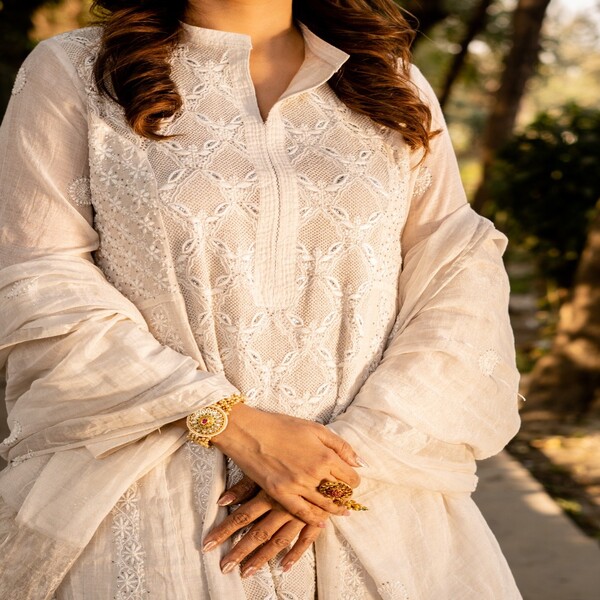 A chikankari silver tissue anarkali is a formal, floor-length anarkali suit made from shimmering silver tissue fabric, featuring traditional hand-embroidered chikankari work, often enhanced with embellishments like sequins or cutdana. It has a flowing, flared silhouette that creates a regal and elegant look, suitable for festive occasions and weddings. Location : Uttar Pradesh, India