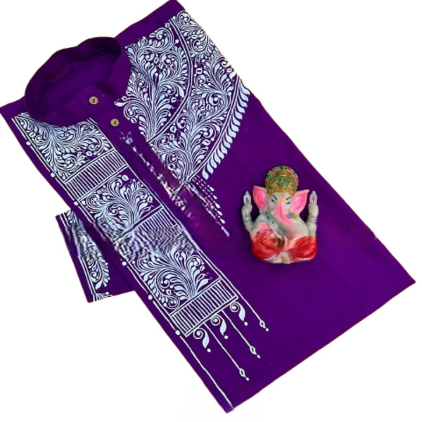 A Kalka Punjabi kurta is a mens long, loose-fitting tunic made of fabric like cotton or khadi cotton, often handcrafted with a Kalka or paisley-like embroidery or hand-painted design. The Kalka refers to the intricate pattern, which are hand-painted or embroidered, making it a decorative, festive, or formal ethnic wear option. Location : West Bengal, India