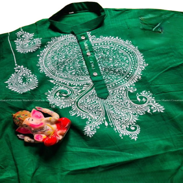 910 Piece Description : A Kalka Punjabi Kurta Is A Mens Long, Loose-fitting Tunic Made Of Fabric Like Cotton Or Khadi Cotton, Often Handcrafted With A Kalka Or Paisley-like Embroidery Or Hand-painted Design. The Kalka Refers To The Intricate Pattern, Which Are Hand-painted Or Embroidered, Making It A Decorative, Festive, Or Formal Ethnic Wear Option. Location : West Bengal, India