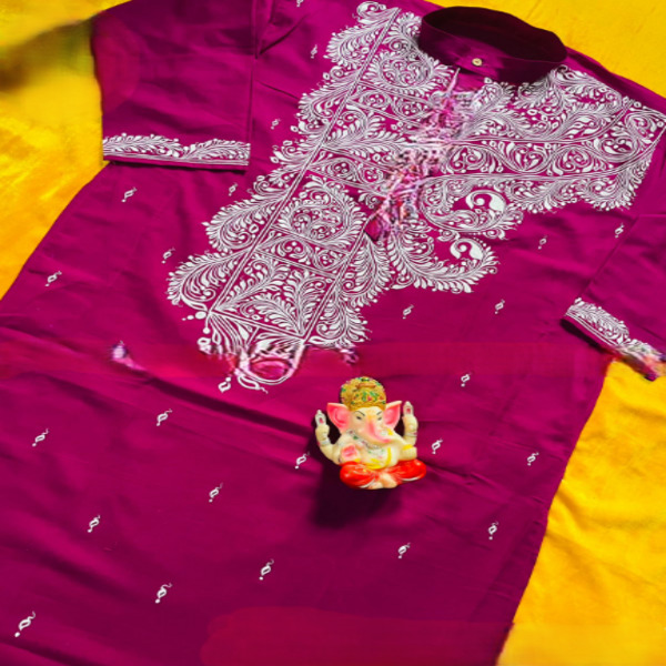 A Kalka Punjabi kurta is a mens long, loose-fitting tunic made of fabric like cotton or khadi cotton, often handcrafted with a Kalka or paisley-like embroidery or hand-painted design. The Kalka refers to the intricate pattern, which are hand-painted or embroidered, making it a decorative, festive, or formal ethnic wear option. Location : West Bengal, India