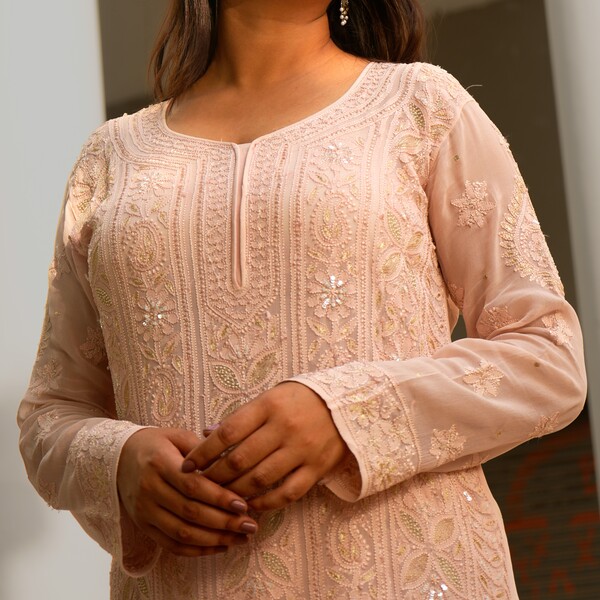5200 Piece Description : A Chikankari Georgette Kurti Is A Classic Piece Of Indian Ethnic Wear That Combines The Intricate, Traditional Hand-embroidery Of Chikankari, Originating From Lucknow, With The Lightweight, Flowy, And Semi-sheer Georgette Fabric. The Kurtis Appeal Lies In The Elegant Contrast Between The Fabrics Soft Drape And The Delicate, Often Floral Or Paisley, Patterns Created Using Various Stitches Like Bakhiya (shadow Work) And Phanda (knots). This Versatile Garment Is Celebrated For Its Comfort And Sophisticated Appearance, Making It A Popular Choice For Both Everyday Elegance And Special Festive Occasions, Where It Is Typically Paired With A Matching Slip And Bottoms Such As Palazzos Or Leggings. Location : Uttar Pradesh, India