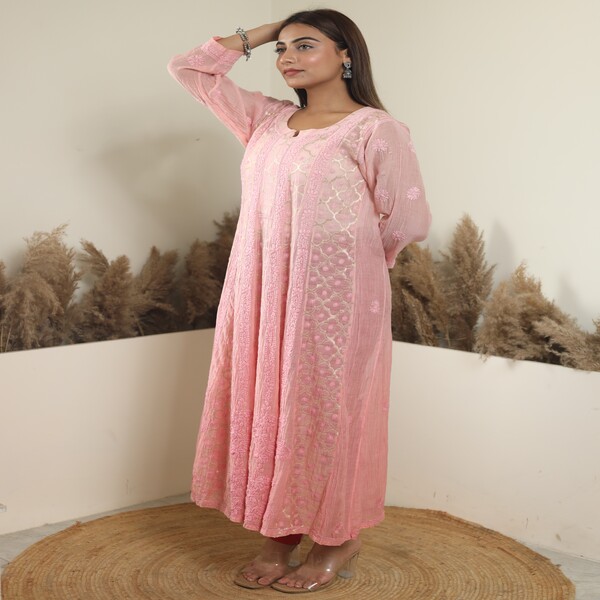 5850 Piece Description : A Chikankari Anarkali Is A Traditional Indian Outfit Featuring The Elegant Anarkali Silhouette Enhanced By Chikankari, A Delicate Hand Embroidery Technique From Lucknow. This Style Combines The Graceful, Floor-length Flow Of The Anarkali With The Intricate, Often White-on-pastel, Hand-stitched Patterns Of Chikankari, Creating A Dress That Is Both Classic And Sophisticated. Location : Uttar Pradesh, India