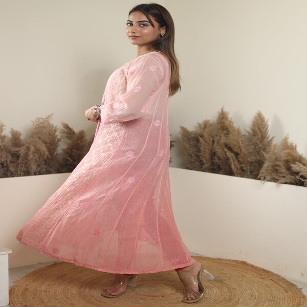 5850 Piece Description : A Chikankari Anarkali Is A Traditional Indian Outfit Featuring The Elegant Anarkali Silhouette Enhanced By Chikankari, A Delicate Hand Embroidery Technique From Lucknow. This Style Combines The Graceful, Floor-length Flow Of The Anarkali With The Intricate, Often White-on-pastel, Hand-stitched Patterns Of Chikankari, Creating A Dress That Is Both Classic And Sophisticated. Location : Uttar Pradesh, India