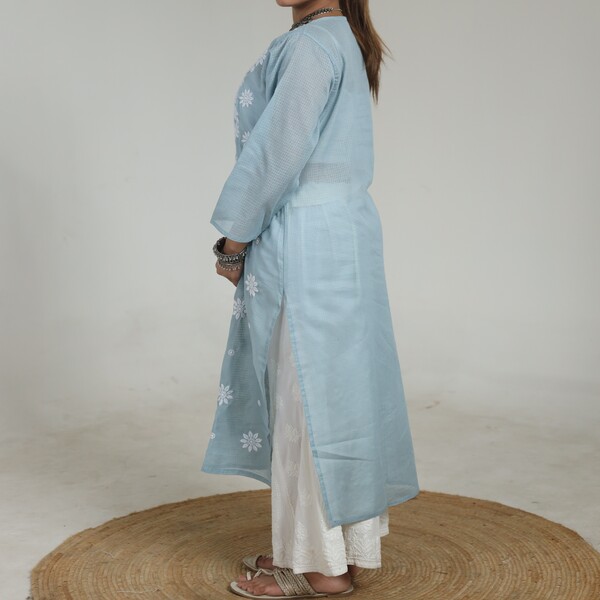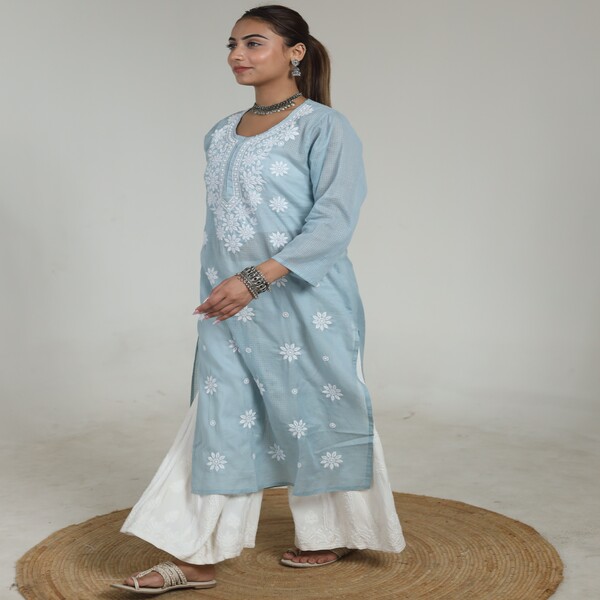 1949 Piece Description : A Chikankari Kurta With A Heavy Yoke Is A Sophisticated Traditional Indian Garment That Features Dense, Intricate Hand Embroidery Concentrated Specifically On The Upper Chest And Shoulder Area. This Elaborate Yoke Design Is A Hallmark Of High Craftsmanship, Distinguishing It From Simpler Kurtas Where Embroidery Might Be Sparse. Artisans Use A Variety Of Traditional Lucknowi Stitches, Such As Bakhiya (shadow Work) And Phanda (knot Work), To Create Rich, Nature-inspired Motifs On Fine Fabrics Like Cotton, Georgette, Or Muslin. Often Crafted With Traditional White-on-white Threadwork, Or Sometimes With Coloured Silk Threads, The Resulting Garment Is Elegant, Textured, And Typically Reserved For Formal Or Festive Occasions Where Its Detailed Artistry Can Be Showcased. Location : Uttar Pradesh, India