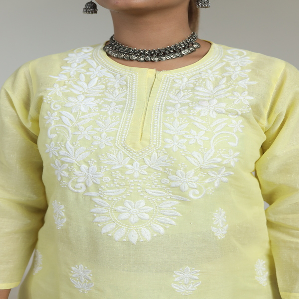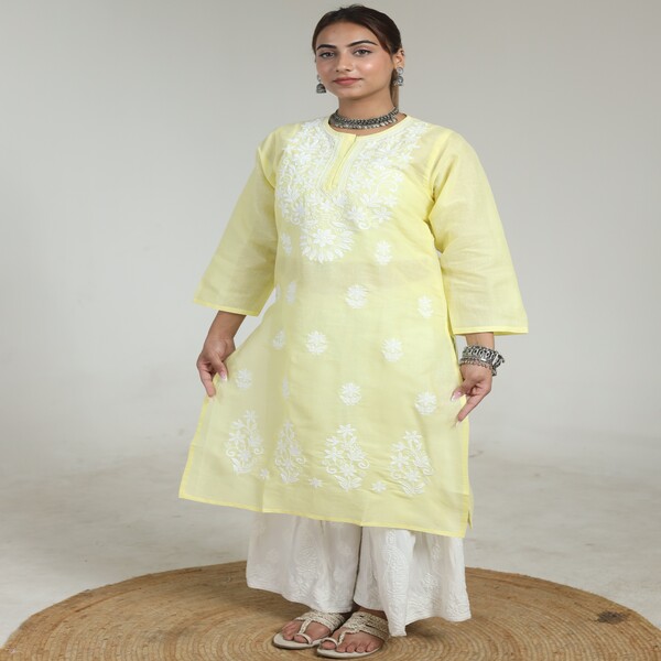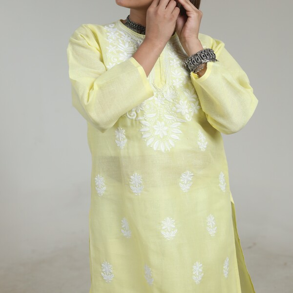 1299 Piece Description : A Chikankari Kurta With A Heavy Yoke Is A Sophisticated Traditional Indian Garment That Features Dense, Intricate Hand Embroidery Concentrated Specifically On The Upper Chest And Shoulder Area. This Elaborate Yoke Design Is A Hallmark Of High Craftsmanship, Distinguishing It From Simpler Kurtas Where Embroidery Might Be Sparse. Artisans Use A Variety Of Traditional Lucknowi Stitches, Such As Bakhiya (shadow Work) And Phanda (knot Work), To Create Rich, Nature-inspired Motifs On Fine Fabrics Like Cotton, Georgette, Or Muslin. Often Crafted With Traditional White-on-white Threadwork, Or Sometimes With Coloured Silk Threads, The Resulting Garment Is Elegant, Textured, And Typically Reserved For Formal Or Festive Occasions Where Its Detailed Artistry Can Be Showcased. Location : Uttar Pradesh, India