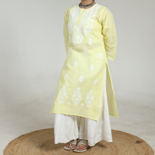 1299 Piece Description : A Chikankari Kurta With A Heavy Yoke Is A Sophisticated Traditional Indian Garment That Features Dense, Intricate Hand Embroidery Concentrated Specifically On The Upper Chest And Shoulder Area. This Elaborate Yoke Design Is A Hallmark Of High Craftsmanship, Distinguishing It From Simpler Kurtas Where Embroidery Might Be Sparse. Artisans Use A Variety Of Traditional Lucknowi Stitches, Such As Bakhiya (shadow Work) And Phanda (knot Work), To Create Rich, Nature-inspired Motifs On Fine Fabrics Like Cotton, Georgette, Or Muslin. Often Crafted With Traditional White-on-white Threadwork, Or Sometimes With Coloured Silk Threads, The Resulting Garment Is Elegant, Textured, And Typically Reserved For Formal Or Festive Occasions Where Its Detailed Artistry Can Be Showcased. Location : Uttar Pradesh, India