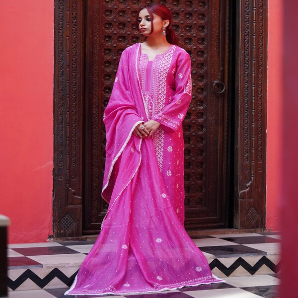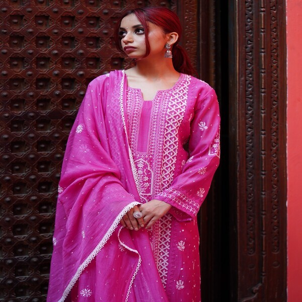 The Chikankari Mul Begum co-ord set is a sophisticated and comfortable two-piece ensemble crafted from lightweight, breathable mulmul cotton fabric. This set is distinguished by intricate, authentic Lucknowi Chikankari hand embroidery, a traditional Indian art form that typically involves delicate shadow work and floral motifs on both the coordinating top and bottom. The design prioritizes both elegance and ease, often featuring a fully lined top with detailed sleeves and wide-leg, flared pants with practical elements like soft elastic waistbands and pockets. The term Begum suggests a regal, graceful aesthetic, making this co-ord set a perfect blend of traditional craftsmanship and modern, wearable style suitable for warm weather and various casual to semi-formal occasions. Location : Uttar Pradesh, India