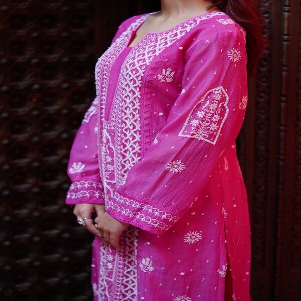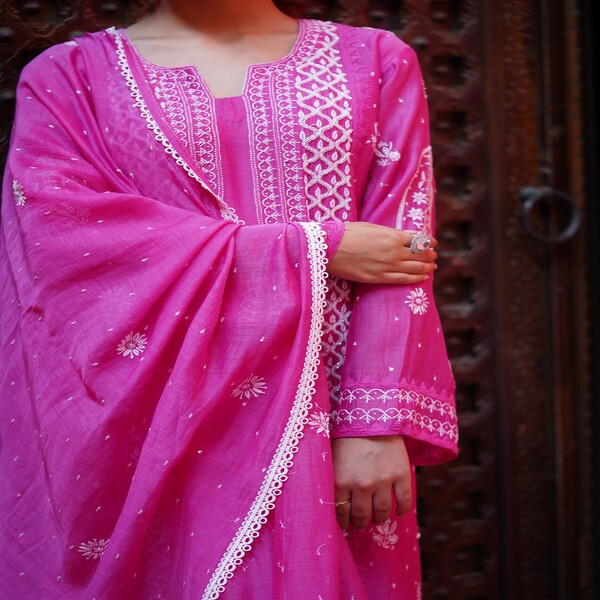 The Chikankari Mul Begum co-ord set is a sophisticated and comfortable two-piece ensemble crafted from lightweight, breathable mulmul cotton fabric. This set is distinguished by intricate, authentic Lucknowi Chikankari hand embroidery, a traditional Indian art form that typically involves delicate shadow work and floral motifs on both the coordinating top and bottom. The design prioritizes both elegance and ease, often featuring a fully lined top with detailed sleeves and wide-leg, flared pants with practical elements like soft elastic waistbands and pockets. The term Begum suggests a regal, graceful aesthetic, making this co-ord set a perfect blend of traditional craftsmanship and modern, wearable style suitable for warm weather and various casual to semi-formal occasions. Location : Uttar Pradesh, India