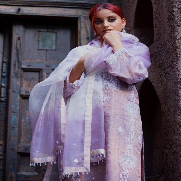 A Chikankari Begum co-ord set is a stylish matching top and bottom ensemble, typically a kurta and pants, that is distinguished by the delicate, intricate hand embroidery of the traditional Lucknowi chikankari craft. The term Begum is a brand-specific name used by several retailers, each offering slightly different product designs, but the core element remains the exquisite hand-stitched threadwork, often in white cotton on a soft fabric. These sets are usually made from light, breathable fabrics such as cotton, muslin, georgette, or silk, making them comfortable and versatile for various occasions from casual daywear to festive events. Designs often feature nature-inspired motifs like flowers, leaves, and vines using various stitches, and the overall silhouette is typically a relaxed, elegant fit that blends traditional artistry with modern style. Location : Uttar Pradesh, India