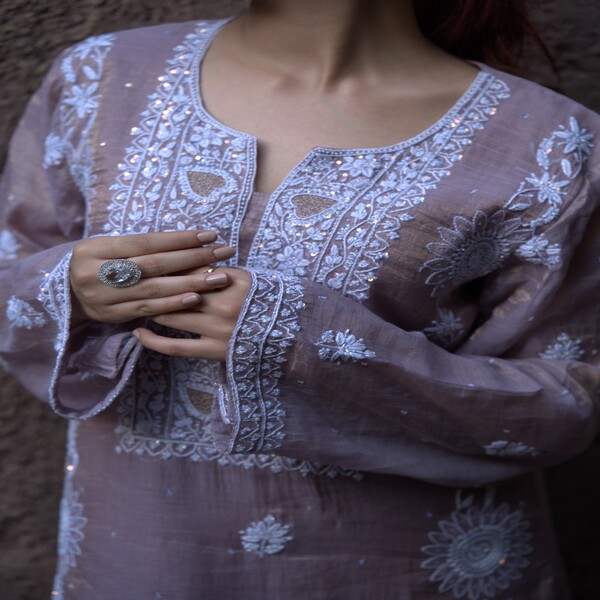 A Chikankari Begum co-ord set is a stylish matching top and bottom ensemble, typically a kurta and pants, that is distinguished by the delicate, intricate hand embroidery of the traditional Lucknowi chikankari craft. The term Begum is a brand-specific name used by several retailers, each offering slightly different product designs, but the core element remains the exquisite hand-stitched threadwork, often in white cotton on a soft fabric. These sets are usually made from light, breathable fabrics such as cotton, muslin, georgette, or silk, making them comfortable and versatile for various occasions from casual daywear to festive events. Designs often feature nature-inspired motifs like flowers, leaves, and vines using various stitches, and the overall silhouette is typically a relaxed, elegant fit that blends traditional artistry with modern style. Location : Uttar Pradesh, India