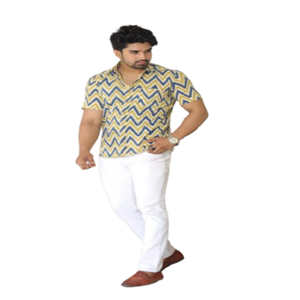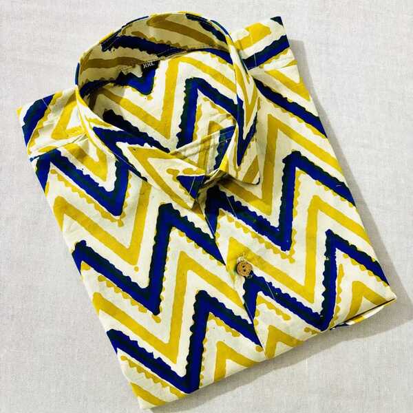 A hand block printed cotton shirt is made from comfortable, natural cotton fabric decorated with designs carved onto wooden blocks by skilled artisans. Each block is used to press a specific color onto the fabric with precision, creating intricate, unique patterns with slight irregularities that highlight the artisanal, handmade nature of the shirt. These shirts are a blend of traditional craftsmanship and modern style, often featuring traditional motifs, and are prized for their breathability and lightweight feel. Location : Rajasthan, India