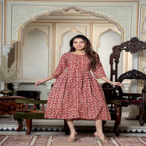 878 Piece Description : A Bagru Hand-block Printed Long One-piece Dress Is A Traditionally Crafted Garment From Rajasthan, India, Made With Eco-friendly Techniques And Natural Dyes. Skilled Artisans, Known As Chippas, Use Hand-carved Wooden Blocks To Stamp Intricate, Earthy-toned Motifs—often Inspired By Nature Or Geometric Patterns—onto Breathable Fabrics Like Cotton Cambric. The Distinctive Patterns Are Created Through A Time-honoured Process That Can Include The Mud-resist (dabu) Printing Method Before The Fabric Is Dyed. This Results In A Comfortable, Lightweight Dress With A Timeless Appeal That Showcases Authentic Craftsmanship. Location : Rajasthan, India