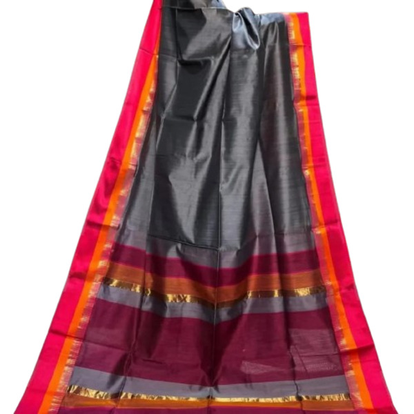 A Maheshwari multi-border saree is a traditional handloom saree from Maheshwar, Madhya Pradesh, made from a blend of silk and cotton, known for its lightweight, soft, and reversible multiple contrasting borders. These intricate borders, often featuring intricate geometric or floral patterns woven with zari (metallic threads), are inspired by the architecture of local forts and palaces. The body of the saree is typically plain, striped, or checkered to highlight the detailed borders and pallu (the decorative end piece). Location : Madhya Pradesh, India