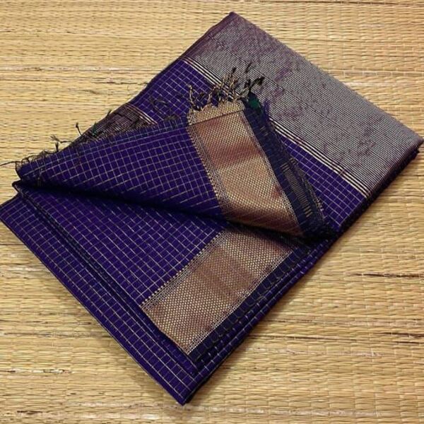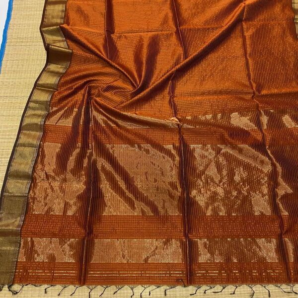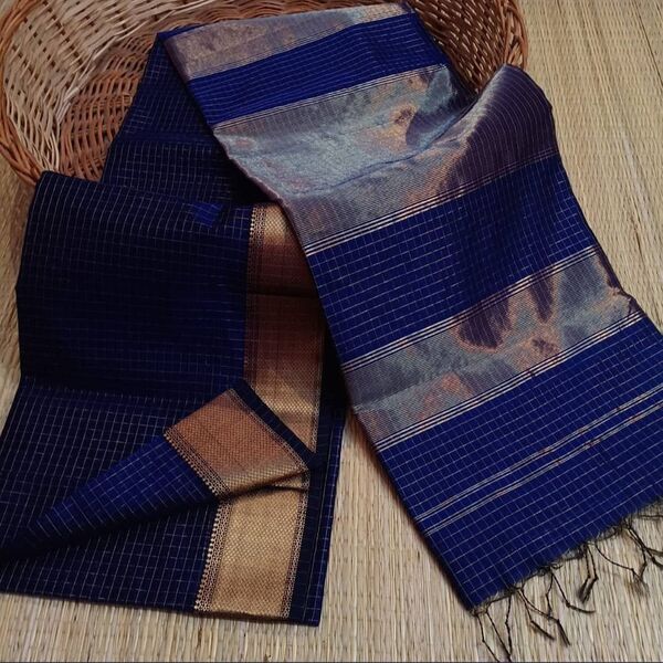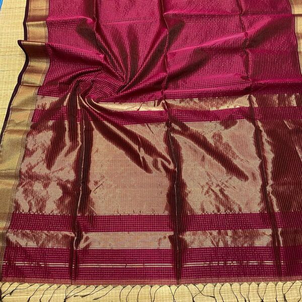 5850 Piece Description : A Maheshwari Zari Checks Saree Is A Lightweight, Handwoven Saree Made From A Blend Of Silk And Cotton, Known For Its Elegant Drape And Intricate Golden Zari Check Patterns. It Typically Features A Distinctive Geometric Design With A Contrasting Border, A Unique Pallu Often With Multiple Colored Stripes, And Is A Classic Fusion Of Traditional Craftsmanship And Contemporary Style. Location : Madhya Pradesh, India