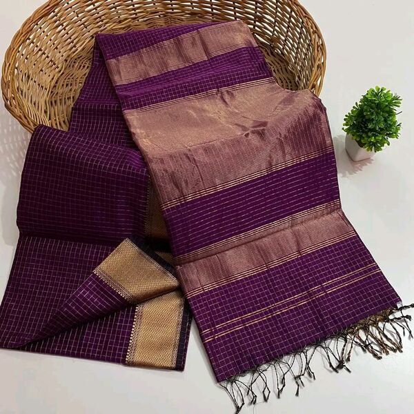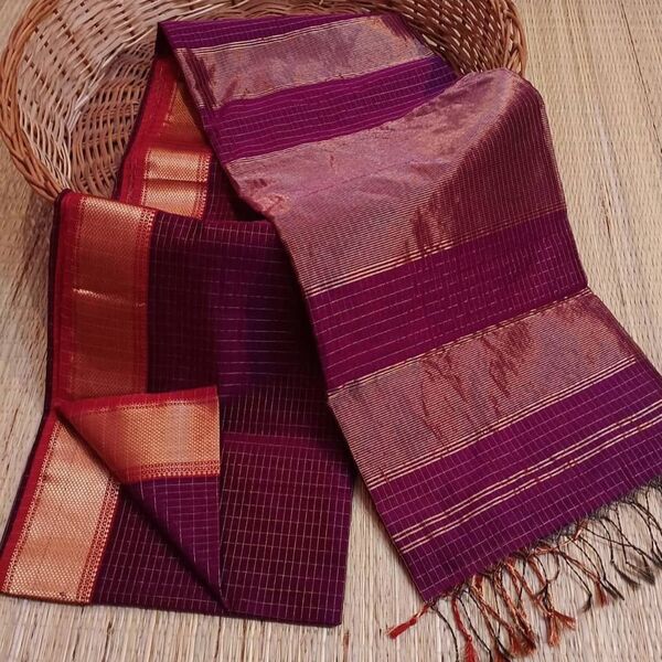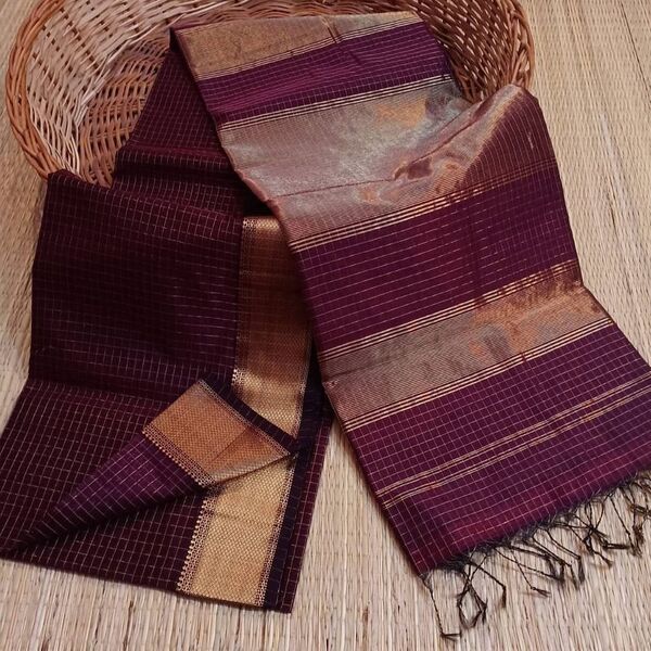 5850 Piece Description : A Maheshwari Zari Checks Saree Is A Lightweight, Handwoven Saree Made From A Blend Of Silk And Cotton, Known For Its Elegant Drape And Intricate Golden Zari Check Patterns. It Typically Features A Distinctive Geometric Design With A Contrasting Border, A Unique Pallu Often With Multiple Colored Stripes, And Is A Classic Fusion Of Traditional Craftsmanship And Contemporary Style. Location : Madhya Pradesh, India