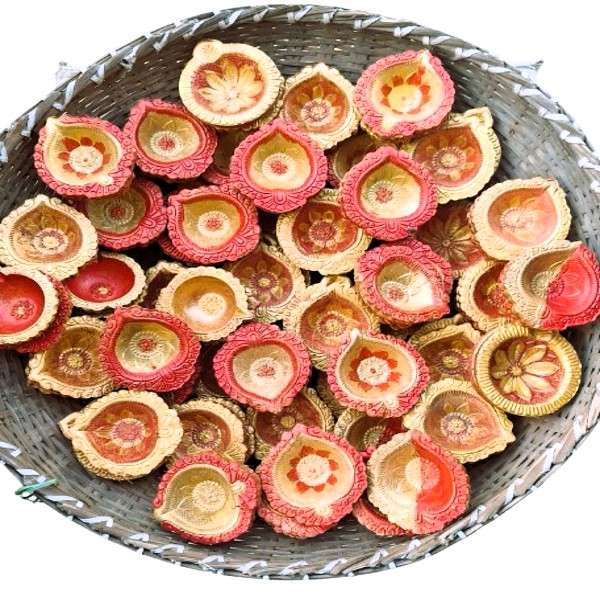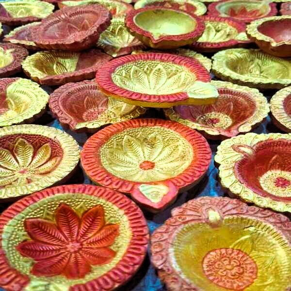 7 Piece Description : Decorative Clay Diyas Are Traditional, Handcrafted Oil Lamps Made From Natural Terracotta Clay And Distinguished By Their Vibrant Colours, Intricate Patterns, And Embellishments. They Serve As Both Functional Lighting And Auspicious Decorations, Especially During Festivals Like Diwali. Location : Assam, India