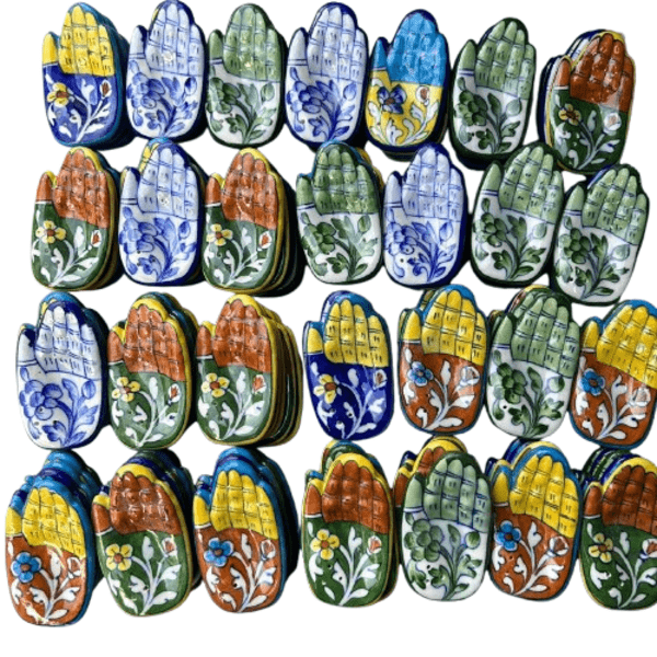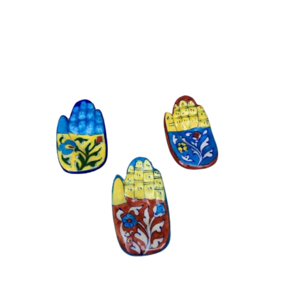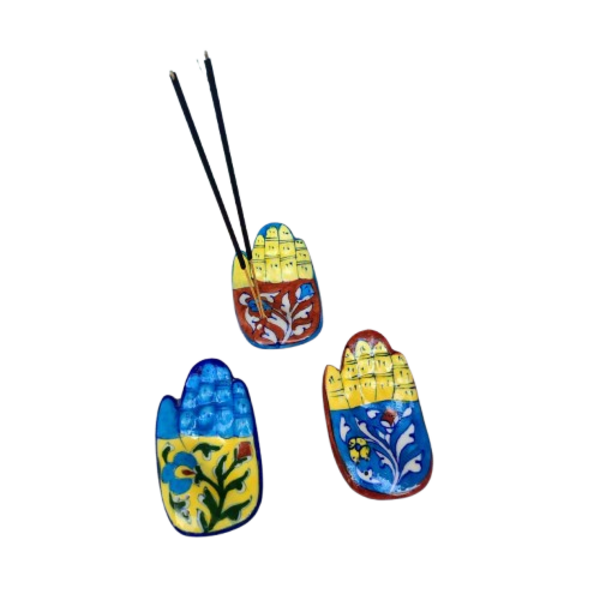 A blue art pottery incense stick holder is a decorative, handcrafted piece, typically from Jaipur, that is designed to burn incense sticks safely while collecting ash. It is characterized by its distinctive, eye-catching blue colour, which comes from cobalt blue dye, and often features intricate hand-painted designs like florals, animals, or geometric patterns. The pottery is durable and has a glossy finish. Location : Rajasthan, India