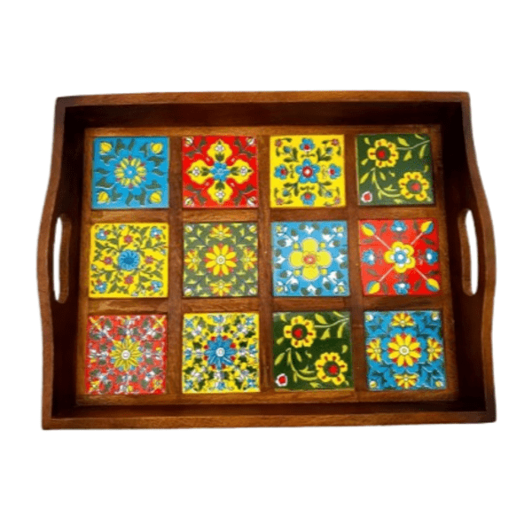 495 Piece Description : A Blue Art Pottery Tile Wooden Tray Is A Handcrafted Item That Combines The Warmth Of A Natural Wooden Base With The Striking Beauty Of Traditional Blue Pottery Tiles, Which Are Typically Made From A Mixture Of Quartz Stone Powder And Powdered Glass. The Tiles, Known For Their Vibrant Cobalt Blue And White Glazes, Usually Feature Intricate, Hand-painted Floral Or Geometric Patterns That Create A Beautiful Contrast Against The Wood Frame. This Fusion Of Materials Results In A Durable And Food-safe Decorative Serving Tray That Is Both A Functional Household Item And A Unique Piece Of Cultural Artistry. Location : Rajasthan, India