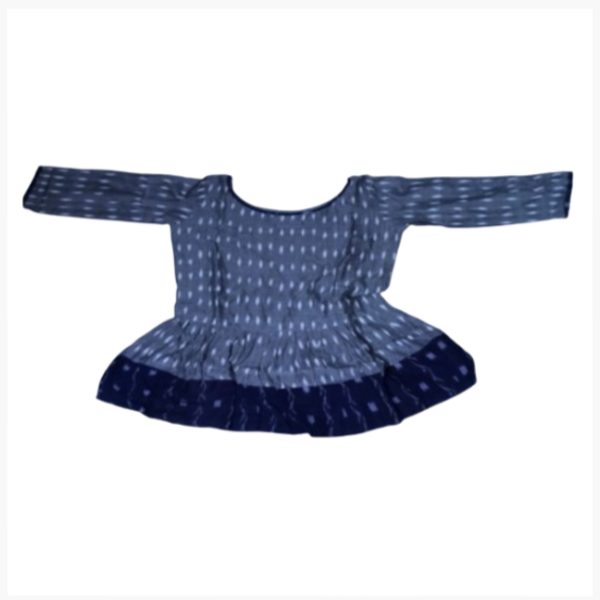 A Sambalpuri top is a handwoven garment, typically a kurti or top, from Odisha, India, made from cotton or silk fabric. It is characterized by the unique Ikat tie-dye technique, which creates intricate and vibrant patterns, often in contrasting colours. These tops are known for being stylish, comfortable, and a representation of the rich cultural heritage of Odisha. Location : Odisha, India