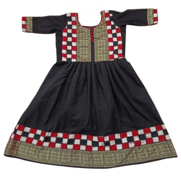 A Sambalpuri kids frock is a traditional and modern garment for girls, featuring intricate Ikat patterns woven into fabric made from cotton or silk. These frocks blend the rich cultural heritage of Odisha with contemporary style, often incorporating vibrant colours, comfortable fits, and designs suitable for both festive occasions and casual wear. They may also be sleeveless or come in various designs, sometimes paired with matching accessories or other garments for a complete outfit. Location : Odisha, India