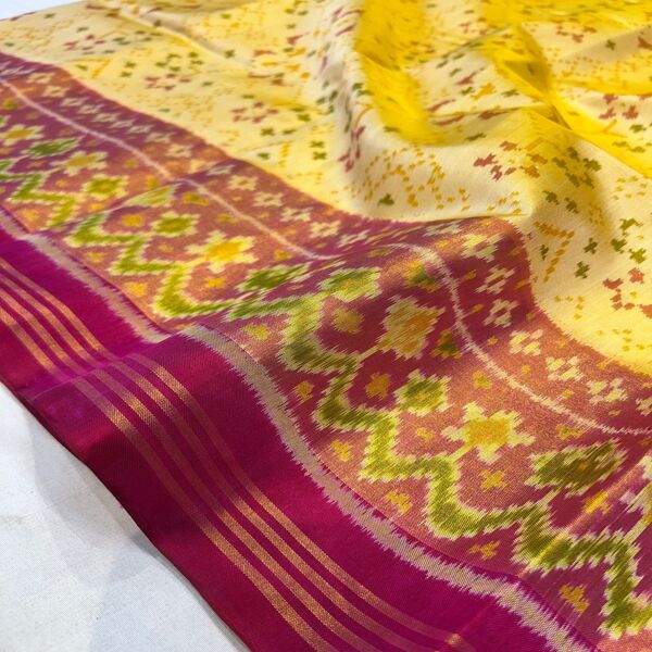 12350 Piece Description : Patola Silk Sarees Are Luxurious, Handwoven Masterpieces From Patan, Gujarat, Renowned For Their Vibrant Colours, Intricate Geometric Patterns, And Complex Double-ikat Technique Where Both Warp And Weft Threads Are Tie-dyed Before Weaving. These Durable, Reversible Sarees Feature Rich, Fade-resistant Natural Dyes And Traditional Motifs Like Elephants, Parrots, And Flowers. Patola Sarees Are Often Considered Heirlooms Due To Their Durability, High-quality, And Timeless, Reversible Designs. Location : Gujarat, India