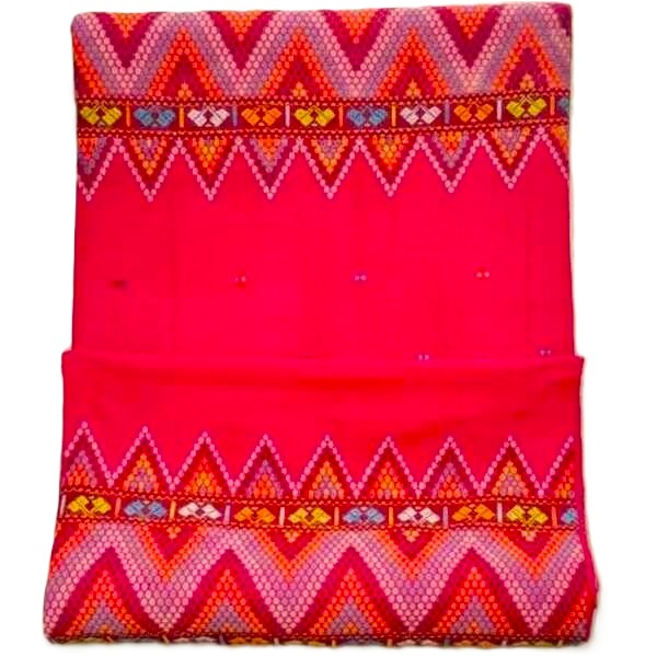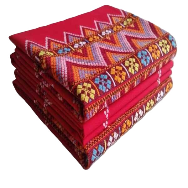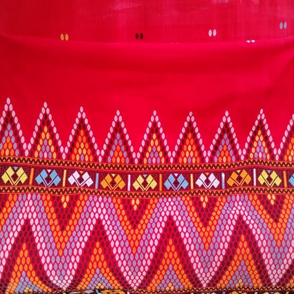 A Mising Mekhela Chadar (or Sadar) is the traditional handwoven two-piece attire of the Mising tribe in Assam, featuring a cylindrical skirt (mekhela/ege) and a draped upper cloth (chadar/sadar/gero) often made from cotton or silk, distinguished by vibrant colours, geometric patterns, and specific tribal motifs like the iconic red and black stripes on white, showcasing both elegance for daily wear and cultural richness for festivals. In essence, the Mising Mekhela Chadar is a beautiful, handcrafted textile art form that embodies the rich cultural traditions of the Mising community of Assam. Location : Assam, India