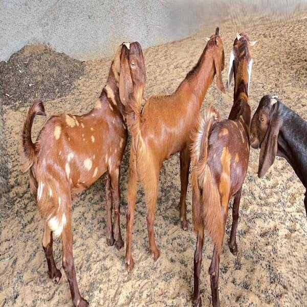 A Sirohi goat kid is a robust, medium-sized baby goat known for its brown coat with distinct patches, leafy drooping ears, and strong build, often born as singles but sometimes twins, showing good weight gain, averaging around 2.5 kg at birth, and developing into hardy adults valuable for meat and milk, thriving in diverse climates. Location : Rajasthan, India