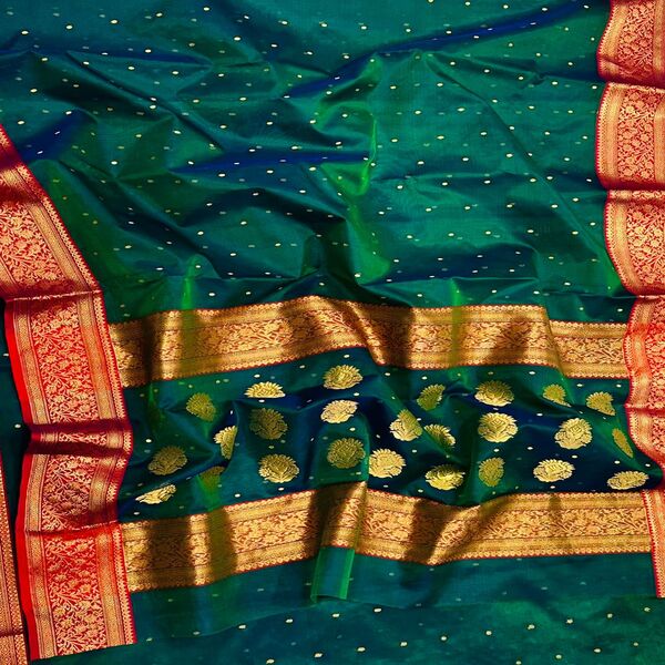 10400 Piece Description : A Chanderi Handloom Katan Silk Saree Is A Luxurious, Lightweight Saree From Chanderi, Madhya Pradesh, Known For Its Blend Of Fine Silk (katan) Threads Woven On A Handloom, Creating A Subtle Sheen, Soft Texture, And Durability, Often Featuring Traditional Motifs Like Coins, Flowers, Or Peacocks With Intricate Zari Work, Perfect For Festive Elegance. It Combines The Lightness Of Chanderi Fabric With The Richness Of Pure, Twisted Silk (katan), Showcasing Traditional Craftsmanship With Unique Patterns And A Distinct Luster, Making It A Prized Heirloom Piece. Location : Madhya Pradesh, India