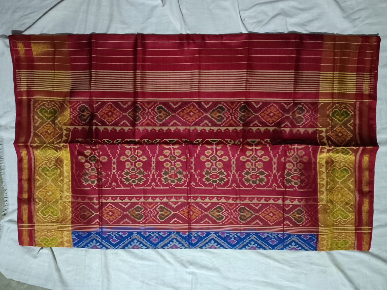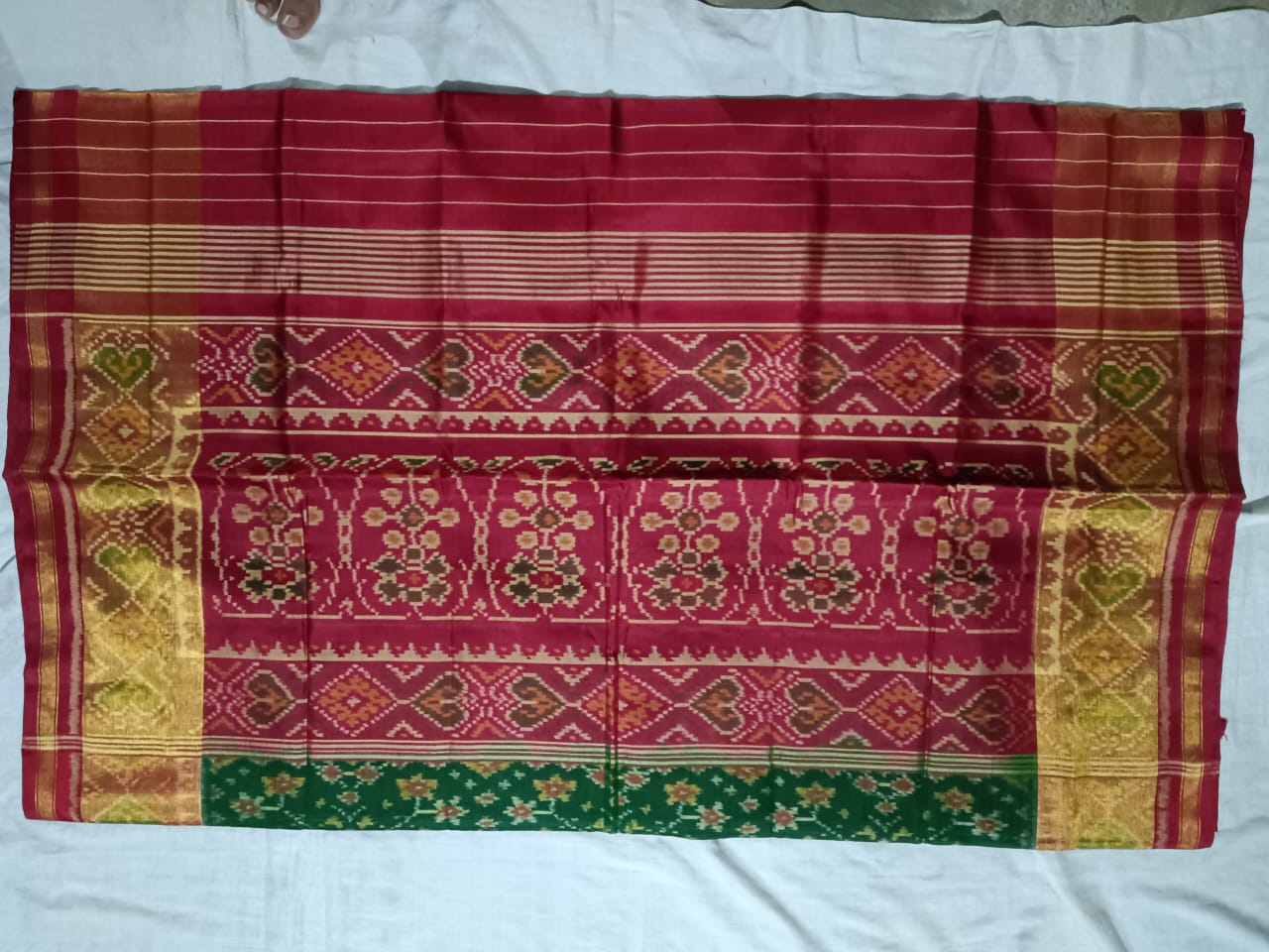 11050 Piece Description : Single Ikat Is A Style Of Interweaving Tied And Dyed Warp With Plain Weft In A Single Textile Form. Single Ikat Sarees From The Rajkot Region Of Gujarat Are Much In Demand For Their Simple Elegance. The Single Ikat Style Of Weaving Is Much Simpler Than The Double Ikat Style, And Hence Sold At Cheaper Prices. Location : Gujarat, India
