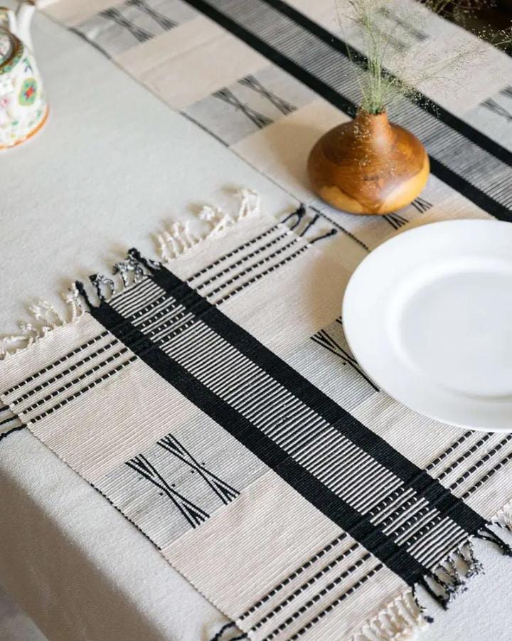 Table runner and mats.Handwoven by tribal women of Nagaland on loin loom. Channel heritage and handwoven tribal story with eye catching Naga table runner and mats. Location : Uttar Pradesh, India