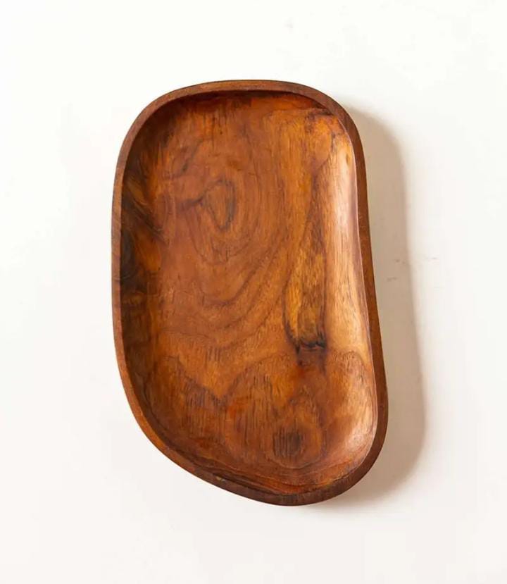 1050 No. Description : Teak Wood Irregular Decor Plate Set Of 2. Made Of Single Wood Block(no Joints). Handmade By Tribal Artisans Of Nagaland. Bring Natural And Bohemian Vibes To Your Table Settings And Decor. Location : Uttar Pradesh, India